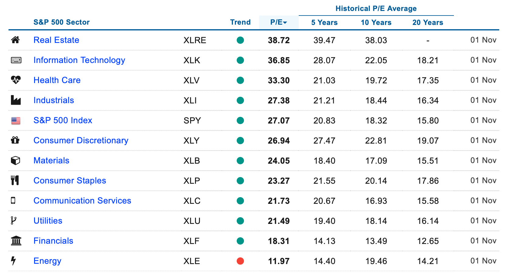 One could argue that the S&P500 deserves a higher multiple because of the larger proportion of the index taken by technology companies, which trade at a premium. However, each individual sector is also extremely expensive. As of Nov 1, all sectors of S&P500 except energy were overvalued vs their own history on P/E[3]. IT was particularly expensive. I have my own concerns about the Energy sector.