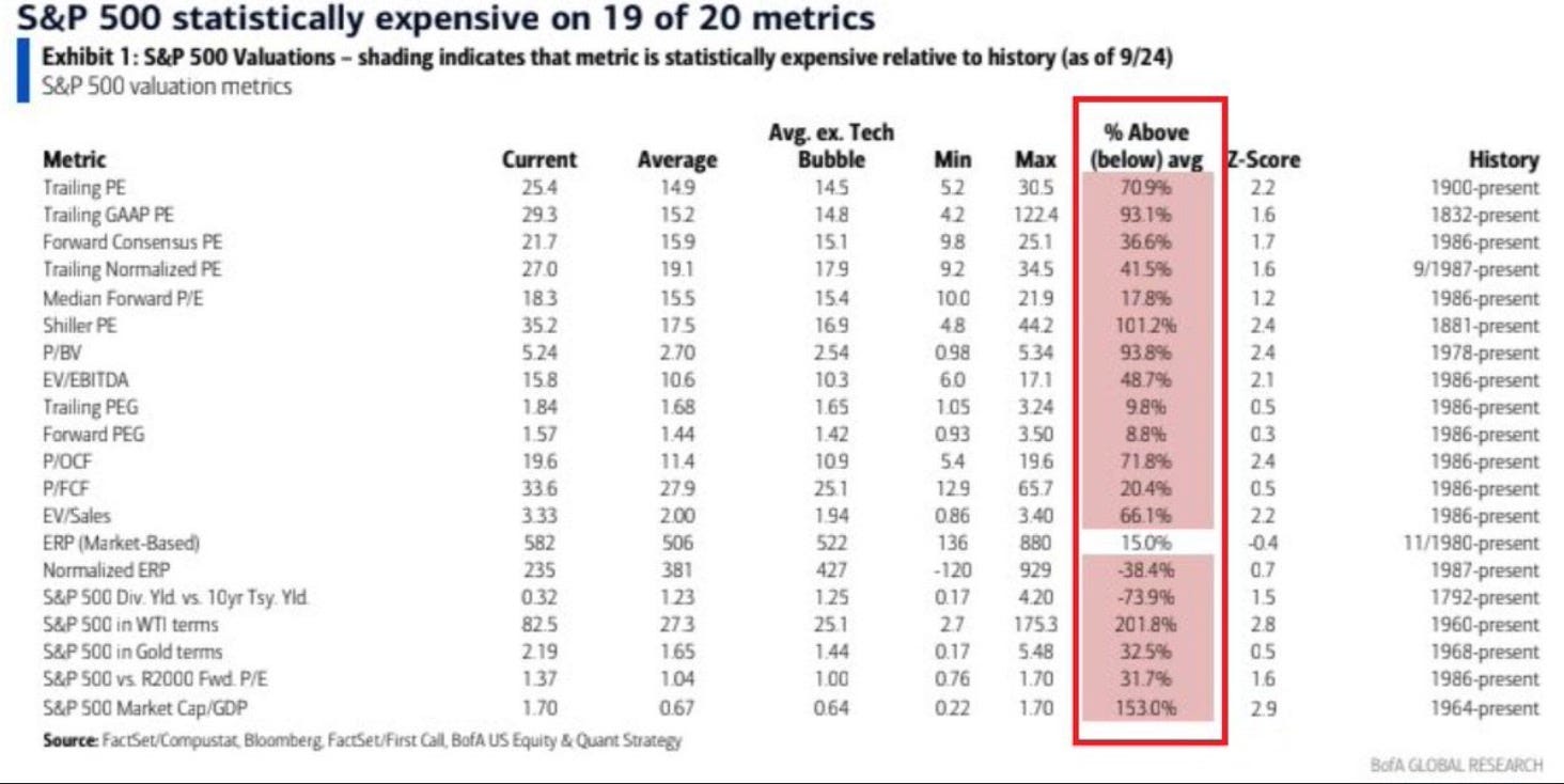 US equities were not just expensive vs bonds as the extremely low ERP shows, but also expensive vs their own history practically on any metric. In particular, they were over 100% more expensive on an important Schiller P/E metric, according to the BoA Quant team [2]. This metric considers earnings over the full business cycle, for example, to account for the fact that margins today are high, which artificially lowers P/E by inflating earnings.